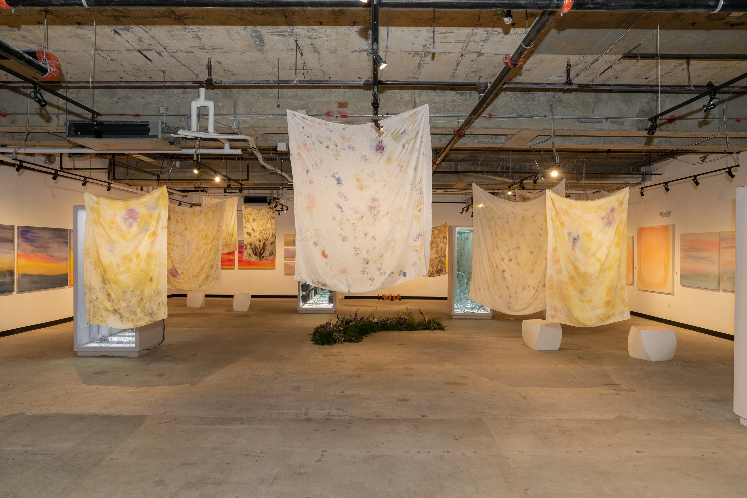 Similar to Monet’s Water Lily series in the Orangerie, Rebirth Into The Light is an invitation for viewers to immerse themselves into the splendor of nature; an awakened spring. The sweeping colorful skies, glorious mountains, limitless constellations, tranquil waters and vibrant florals are experienced and expressed through painting, textiles and installation. Engaging all of the senses, Rebirth Into The Light is a calling to step back into the light of the garden; reawakening the senses to a new hope, to visions of new possibilities for the future.